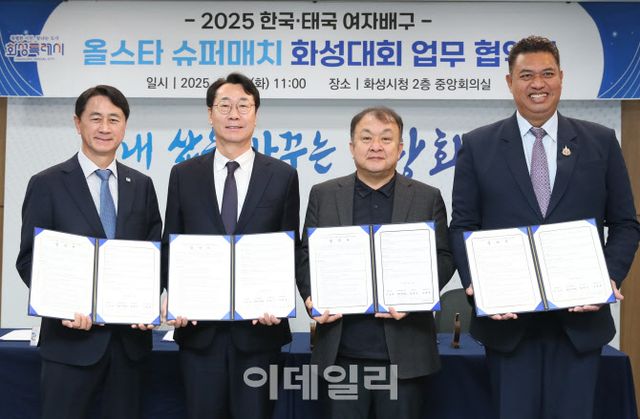 12일 경기 화성특례시에 따르면 정명근 화성특례시장과 박현철 KBSN 스포츠본부 본부장, 신무철 한국배구연맹(KOVO) 사무총장, 키아티퐁 랏차따끼엔까이 태국배구협회 부회장 등은 지난 11일 화성시청에서 이같은 내용의 업무협약을 체결했다.