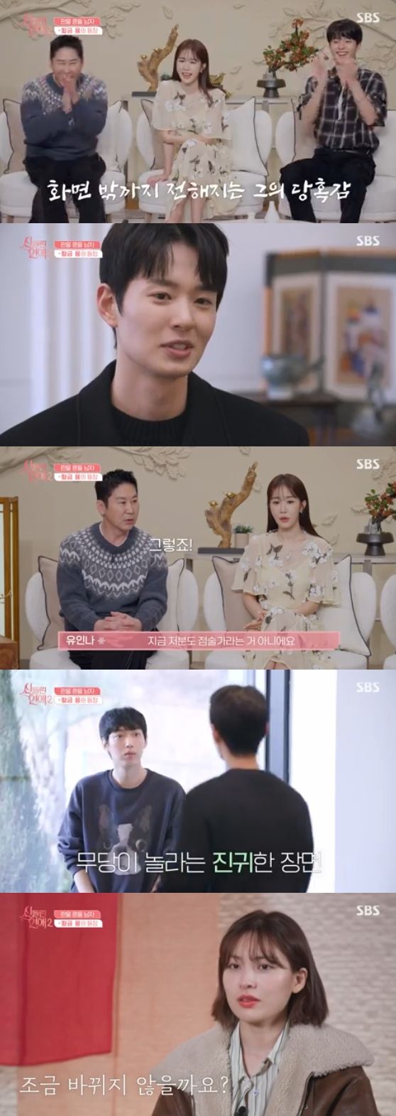 187cm의 훤칠한 키에 화려한 비주얼로 '신들린 연애2' MC들까지 사로잡은 '황금 용' 윤상혁이었다. 유인나는 윤상혁을 보자마자 "진짜 올 것이 왔다"면서 흥미로워했다.