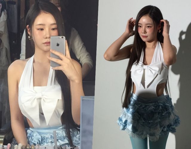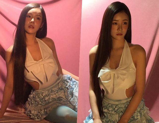 공개된 사진 속 김민설은 스카이톤의 스타킹과 초미니 스커트에 화이트 상의를 입고 카메라를 응시하고 있다. 생머리를 길게 내려뜨린 김민설은 인형같은 자태로 시선을 압도한다.