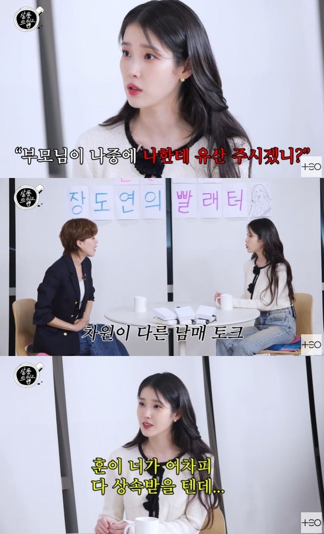 또 아이유는 "훈이(남동생)한테 '네가 진짜 효도해야지. 부모님 나중에 돌아가실 때 나한테 유산 주시겠니' 라는 말도 했다"며 "왜냐하면 나는 금전적으로 (여유로우니까) 나한테 물려주실 생각이 없으실 것 같다"고 차원이 다른 남매 토크를 자랑했다.