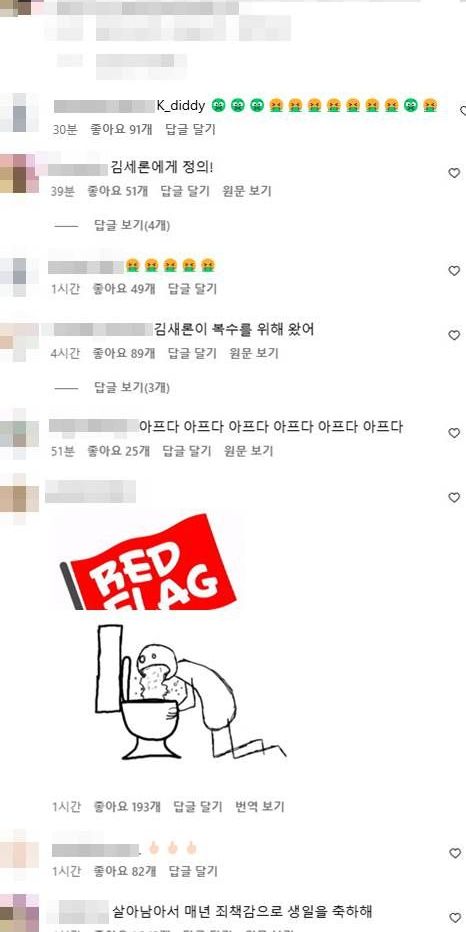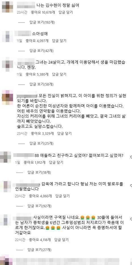 김수현 계정 게시글에는 "그녀는 24살이고, 개에게 이용당해서 생을 마감했습니다", "한 어른이 순진한 미성년자와 함께하며 아이를 이용했습니다. 어린 배우의 연약함을 이용했습니다", "애들하고 친구 하고 싶었어? 젊어 보이고 싶었어?", "감옥에 가야 한다. 저는 이미 언팔 했습니다", "사실이라면 구역질 나네요. 중학생 때부터 6년간 그루밍 성범죄 저지르다가 죽음에 이르게 한 것", "김수현 생일이 김새론 기일인 건 변하지 않는 사실" 등의 악성 댓글이 가득하다.