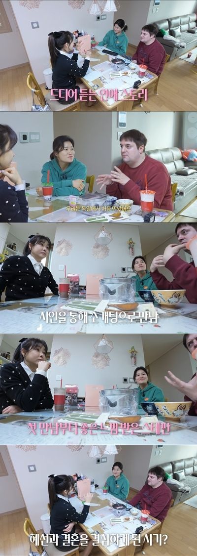 현영은 두 사람의 연애 스토리에 대해 질문했다. 스테판은 "독일에서 처음 만났다. 김혜선이 2년 반 동안 독일에서 유학했을 때 지인 통해 소개팅"이라고 밝혔고, 현영이 첫인상을 묻자 "생각보다 진짜 더 행복했다. 처음부터 많은 이야기를 나눴다"고 대답했다.