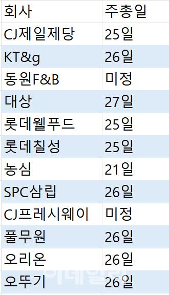 12일 금융감독원 전자공시스템을 보면, 매출 3조원 이상이 되는 상장 식품회사는 주로 25~26일 사이에 정기 주총을 연다. 특히 26일이 식품기업 주총이 집중되는 슈퍼주총데이가 될 예정이다. 이날 CJ(001040)와 KT&G(033780), SPC삼립(005610), 풀무원(017810), 오리온(271560), 오뚜기(007310)가 주총을 개최한다.