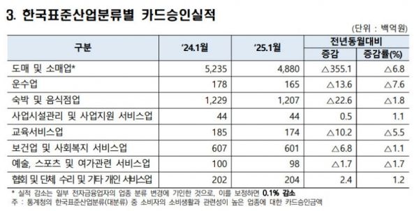 지난해 12월 비상계엄 사태로 타격을 받았던 숙박·음식점업 카드 매출 역시 같은 기간 12조2천700억원의 매출을 기록해 지난해 동기 대비 2천200억원가량(1.8%) 떨어졌다. 보건업 및 사회복지서비스업(6조700억원→6조100억원)도 1.1% 감소했고, 예술·스포츠·여가 관련 서비스업(1조원→9천800억원) 역시 1.7% 줄어들었다.