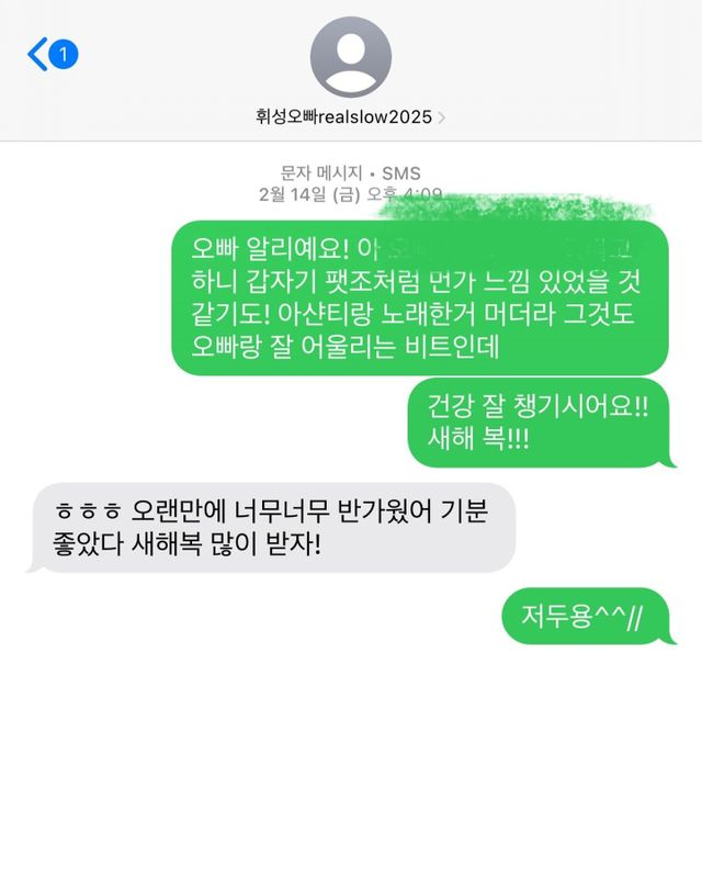알리는 지난달 14일 휘성에게 건강 잘 챙기고 새해 복 많이 받으라는 문자를 보냈고 휘성은 "ㅎㅎㅎ 오랜만에 너무 반가웠어. 기분 좋았다. 새해 복 많이 받자!"라고 답했다.