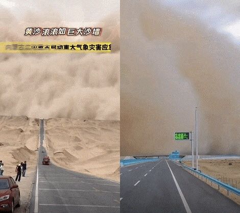도로를 달리는 차량 앞으로 최대 초속 30m가 넘는 강풍이 불자 순식간에 앞을 전부 가릴 만큼 높은 모래 벽이 쌓였다. 또 다른 영상에서는 모래 폭풍이 일어나자 도로가 뿌옇게 변해버렸고, 그 사이를 차들이 달리는 모습이 담겼다. 어떤 행인들은 차에서 내려 모래폭풍을 눈으로 직접 확인하기도 했다.