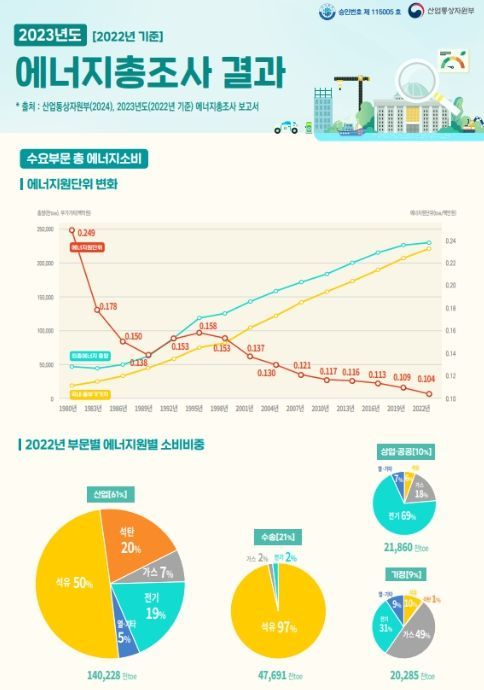 [와이뉴스] 산업통상자원부는 3월 13일 2023년도 에너지총조사(2022년 기준 에너지소비량) 결과를 발표했다. 에너지총조사는 '에너지법' 제19조에 따라 1981년부터 매 3년마다, 업종·용도별 에너지 소비구조의 특성 등을 파악하기 위해 실시하고 있다.