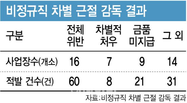 감독 결과 비정규직을 차별 대우한 사업장 7곳은 명절상여금이나 복지포인트, 경조금, 하계휴가비 등을 비정규직엔 주지 않거나 정규직보다 적게 지급한 것으로 나타났다. 총 583명의 근로자가 3억 5600만원 상당의 차별을 받았다.