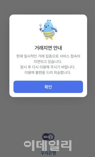우리WON뱅킹 앱은 오늘 오후 1시 20분부터 2시 20분께까지 접속이 불가했다. 우리은행은 첫 화면에 “현재 일시적인 거래 집중으로 서비스 접속이 지연되고 있습니다”라며 거래지연을 안내했다.