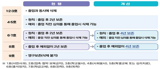 특히 대입을 앞둔 고3은 물론 고1·2학년도 학폭을 주의해야 한다. 처분 수위에 따라 기록 보존기간이 늘어날 수 있어서다. 교육부에 따르면 4호·5호 처분은 졸업 후 2년간 기록이 보존된다. 특히 6호·7호·8호 처분은 보존기간이 4년으로 늘어난다. 이 가운데 6·7호 처분은 졸업 전 심의를 통해 삭제할 수 있지만 8호(전학) 처분은 예외 없이 4년간 기록이 유지된다. 가장 무거운 징계인 9호(퇴학) 처분은 영구 보존되며 삭제가 불가하다. 징계 수위에 따라 재수·N수까지 학폭 기록이 영향을 미치게 되는 것이다.