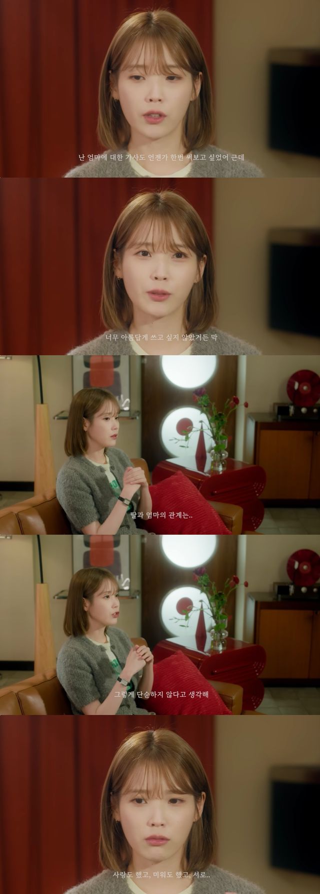 'Shh'를 쓰고 아이유는 "후련했다. 엄마에 대한 곡을 써보고 싶었는데 너무 아름답게 쓰고 싶지 않았다. 찬양하고 사랑하는 걸로만 쓰고 싶지 않았다"며 "딸과 엄마의 관계는 단순하지 않다고 생각한다. 단순한 아름다운 사랑 노래로 '엄마' 주제를 쓰고 싶지 않았다. 복잡하다는 걸 항상 이야기하고 싶었다. 사랑하는데 사랑만이 다는 아니다. 이 관계 형성까지 우린 사랑도 했고 미워도 했고 갈등도 있었다"며 복합적인 엄마라는 존재에 대한 생각을 밝혔다.