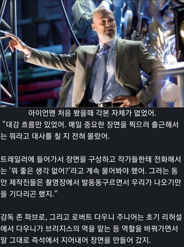아이언맨 1 제작당시 각본가 둘은 기저귀에 똥싼다는 글만 쓰고 도망가서 쪽대본으로 로다주랑 파브로가 직접 썼야했다.