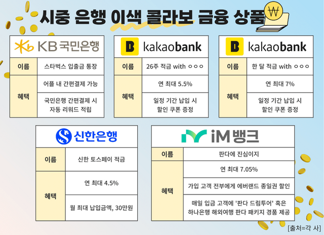 유통 및 식음료 업계와의 콜라보 금융상품을 활발히 선보이고 있는 대표적인 금융사는 카카오뱅크다. 카카오뱅크는 자체 인기 상품인 '26주 적금'과 '한 달 적금'을 활용해 다양한 제휴 금융상품을 출시하고 있다.