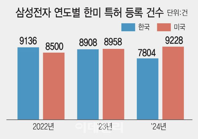 지난해 삼성전자는 35조원 규모의 연구개발(R&D) 투자를 통해 한국과 미국에서 1만 7032건의 특허를 등록했다. 지난해 국내에서 등록한 특허가 7804건, 미국 특허가 9228건에 달한다. 삼성전자는 미국 현지 특허를 2022년 8500건, 2023년 8958건으로 꾸준히 확대하고 있다.