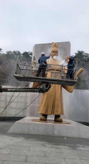 수원시는 12일 정조대왕 동상에 겨우내 쌓인 먼지를 고압세척기로 제거하고, 산화된 부분은 깨끗하게 정비했다. 물과 중성세제를 혼합한 세척액을 사용해 동상 표면을 청소하고, 부드러운 천으로 닦아 먼지와 녹을 말끔하게 제거했다.
