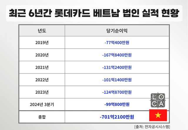 그러나 조 사장의 노력과 별개로 롯데파이낸스베트남의 경영 상황은 갈수록 악화되고 있다. '돈 먹는 하마'라는 평가까지 나올 정도다. 2019년 첫 해 77억400만원의 적자를 낸 롯데파이낸스베트남은 조 사장 취임 이후에도 매년 100억원이 넘는 순손실을 기록했다. 롯데파이낸스베트남의 최근 5년 간 순손실 규모는 ▲2020년 167억8400만원 ▲2021년 131억2400만원 ▲2022년 101억1400만원 ▲2023년 124억8700만원 ▲2024년 3분기 99억800만원 등이었다. 전체 손실액은 700억원에 달하는 것으로 추산됐다.
