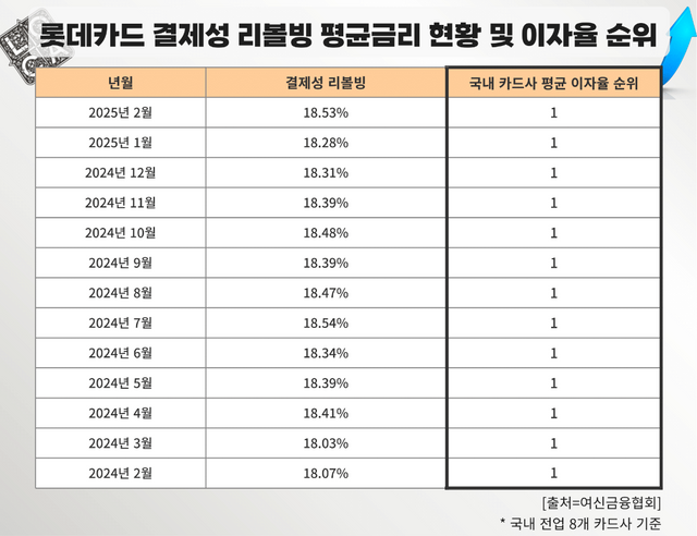 상황이 이렇다 보니 국내에선 조 대표의 경영 행보에 대한 곱지 않은 시선이 일고 있다. 해외 법인에 대해서는 퍼붓기에 가까운 자금 지원과 더불어 저금리 영업까지 단행할 정도로 적극적인 반면 국내에서는 과도한 수익 창출 행위에만 골몰하고 있다는 이유에서다. 여신금융협회 공시정보포털에 따르면 지난 12월 말 기준 롯데카드의 결제성 리볼빙 평균 금리는 18.31%에 달했다. 금리가 제일 낮은 삼성카드(15.66%)에 비해 2.6%p 이상 높은 수준으로 7개 전업 신용카드사 중 리볼빙 평균 금리가 18%를 넘는 곳은 롯데카드가 유일했다. 롯데카드는 지난해 1년 내내 결제성 리볼빙 이자 1위 자리에서 한 차례도 내려오지 않았다.