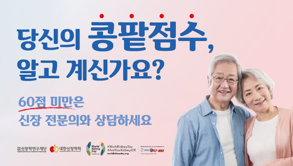 올해 캠페인의 주요 메시지는 ’당신의 콩팥점수 알고 계신가요? 60점 이하는 신장 전문의와 상담하세요‘로 콩팥건강 상태를 점검하고 조기진단의 중요성을 알리는 데 초점을 맞추고 있다.