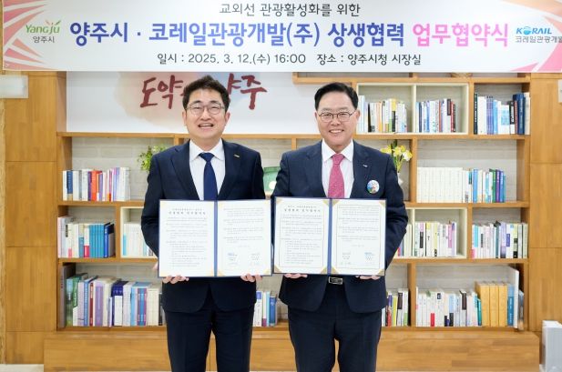 [파이낸셜경제=김예빈 기자] 양주시가 12일 오후 ‘코레일관광개발’과 함께 교외선 관광수요 유치를 위해 철도관광 인프라 및 홍보 채널 활용을 통한 ‘지역관광 활성화 상생협력 업무협약’을 체결했다고 밝혔다.