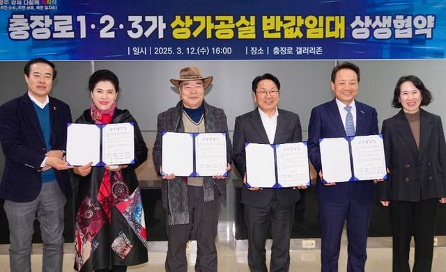 광주광역시는 충장로1・2・3가 상인회와 상가 건물주, 광주 동구와 함께 12일 동구 충장로 갤러리존에서 ‘충장로 1・2・3가 활성화를 위한 반값 임대료 상생협약식’을 개최했다.