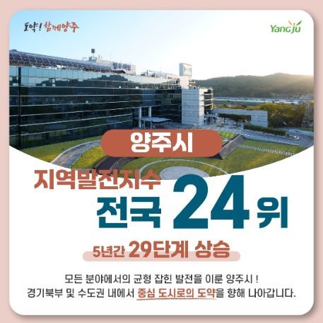 강수현 양주시장이 “이번 지역발전지수 상승은 시민 여러분과 함께 만들어낸 결과이다”며 “우리 양주시가 경기북부를 넘어 수도권의 새로운 중심 도시로 자리 잡을 수 있도록 최선을 다하겠다”고 밝혔다.