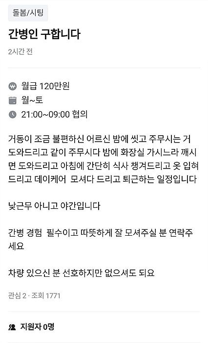 [일요시사 취재2팀] 박정원 기자 = 거동이 불편한 노인을 돌보는 간병인을 월급 120만원에 구인한다는 글이 올라와 논란이 일고 있다. 최근 국내 로컬 중고거래 플랫폼 ‘당근마켓’에는 ‘간병인 구합니다’라는 제목의 글이 게재됐다.