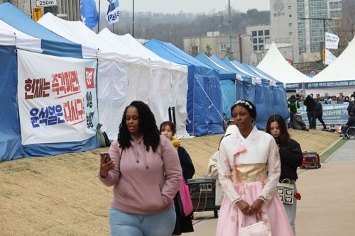 탄핵 선고를 앞둔 12일 외국인 관광객들이 서울 종로구 광화문 인근에 설치된 탄핵 촉구 장외 농성 텐트 인근을 지나치고 있다. 2025.3.12