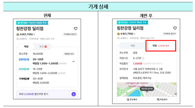배달의민족 앱 가게상세 전후 비교. ⓒ 우아한형제들