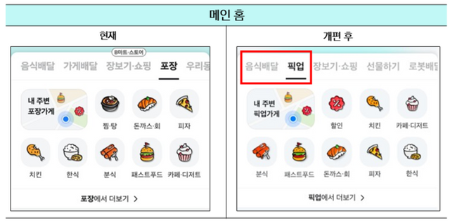배달의민족 앱 메인 홈 전후 비교. ⓒ 우아한형제들