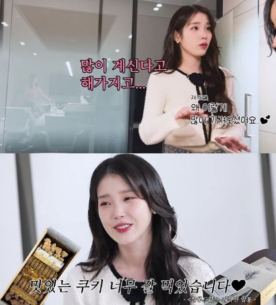 이를 지켜본 한 스태프가 "왜 이렇게 많이 가져오셨냐"고 놀라자 아이유는 "많이 계신다고 들었다"며 인원수대로 선물을 사 왔다고 이야기했다.