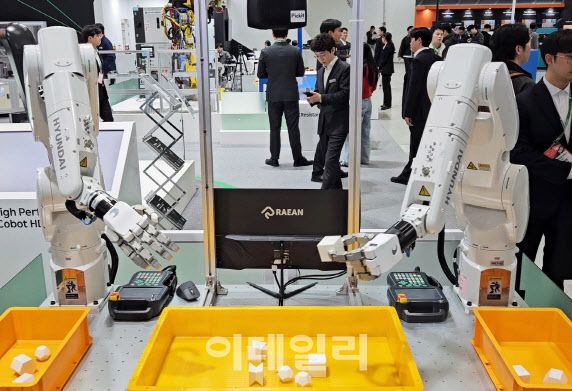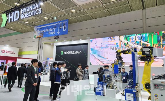 HD현대(267250)그룹 로봇 계열사 HD현대로보틱스는 이번 전시에서 AI를 접목해 용접을 하는 협동로봇 기술력을 뽐냈다. 자동차 공장 등 작업장 천장에 협동로봇을 설치하면, 로봇이 AI로 주변 공간을 인식해 스스로 라인을 타고 움직이며 용접을 자동으로 진행한다.