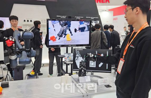 정호상 에이딘로보틱스 선행개발1팀장은 전시 부스에서 장갑 형태의 ‘데이터 글러브’를 착용하고 손가락을 움직이자, 원격으로 연결된 로봇 핸드가 육안으로는 시차 없이 똑같이 움직였다. 정 팀장은 “사람이 착용한 글러브에서 0.01초 단위로 데이터가 전송되면 0.01초 정도 통신망을 거쳐 로봇 핸드가 0.001초 단위로 반응하며 모방 동작을 한다”고 설명했다.