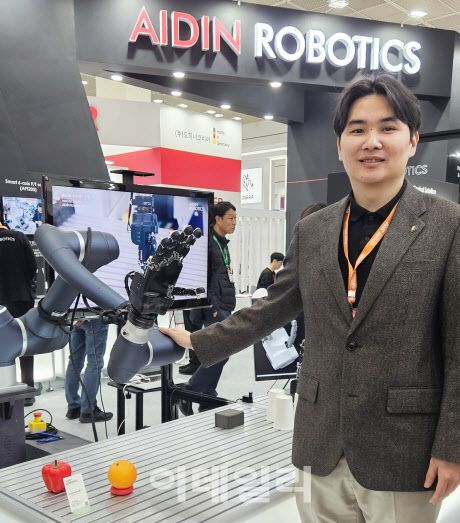 이날 에이딘로보틱스는 센서 외에도 자체 개발한 ‘인간형 로봇 핸드’를 새로운 데모로 공개했다. 실시간 원격제어(텔레오퍼레이션) 모션 알고리즘을 적용해 유·무선으로 통신이 연결된 상태라면 수 킬로미터 떨어진 원거리에서도 정교하게 조작할 수 있다. 손끝에 정밀한 힘·토크 센서를 탑재해 물체를 자연스럽게 감지하고 섬세한 핸들링도 가능하다