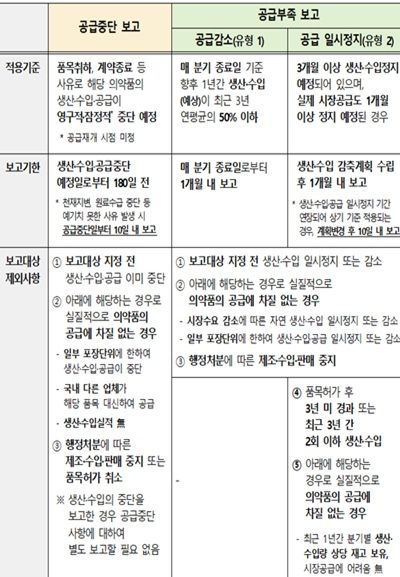 주요 내용은 ▲공급중단 보고시점 변경(60일 전 → 180일 전) 등 총리령 개정사항 반영 ▲공급부족 보고대상이 되는 생산·수입 감소 기준[(유형 ①) 최근 3년 연평균 대비 향후 1년간 생산·수입량 1/2 이하로 감소, (유형 ②) 생산·수입 3개월 이상 일시 정지되고, 시장공급 1개월 이상 일시 정지]마련 ▲공급중단/부족보고 대상 및 예외기준 명확화 등이다.