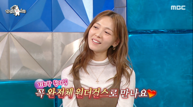 12일 방송된 MBC ‘라디오스타’(‘라스’)에 출연한 선예는 원더걸스 재결합 계획을 묻는 김구라의 질문에 “굉장히 많은 분들이 물어보시고 궁금해 하신다”며 운을 뗐다.