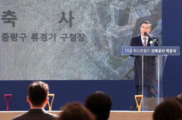 | ▲ 지난 5일 열린 상봉동 더샵 퍼스트월드 신축공사 착공식에서 류경기 중랑구청장이 축사하고 있는 모습 |