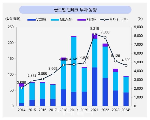 기업공개(IPO) 시장의 침체로 핀테크 기업의 투자 회수도 어려움을 겪고 있다. 2024년 핀테크 기업의 투자 회수 규모는 373억 달러로 전년(285억 달러) 대비 소폭 반등했지만, 회수 거래 건수는 2022년 399건에서 2024년 367건으로 3년 연속 감소했다. 보고서는 투자자들이 여전히 신중한 태도를 유지하고 있다고 분석했다.