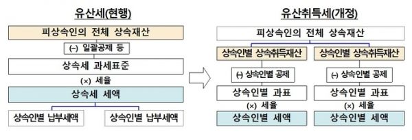 | 정부가 현행 '유산세'에서 '유산취득세'로 전면적인 상속세 개편 방안을 발표했다. [기획재정부 제공] |