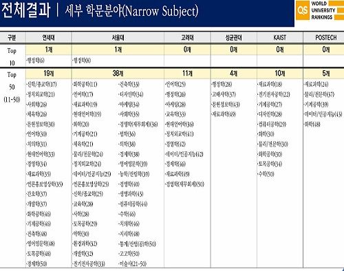 2025년 QS 학문분야평가 결과 서울대 47개, 연세대 38개, 고려대가 32개 분야에서 세계 100위권에 진입했다.