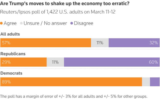 로이터 통신과 여론조사기관 입소스가 전날부터 이날까지 양일간 미국인 성인 1422명을 상대로 실시해 이날 공개한 여론조사(오차범위 ±3%포인트)에 따르면 응답자의 57%는 트럼프 대통령의 경제 정책에 대해 이처럼 평가했다. 32%는 “아니다”라고 답했고, 11%는 답하지 않았다. 공화당원의 89%도 “너무 변덕스럽다”는 평가에 동의했다.