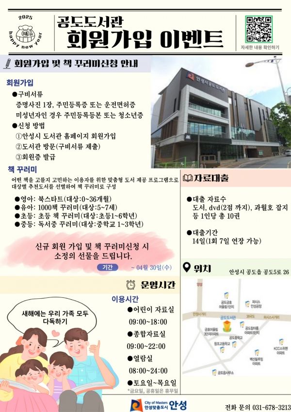 자세한 내용은 공도도서관 누리집을 통해 확인할 수 있으며, 문의는 도서관 유선 전화를 통해 가능하다.