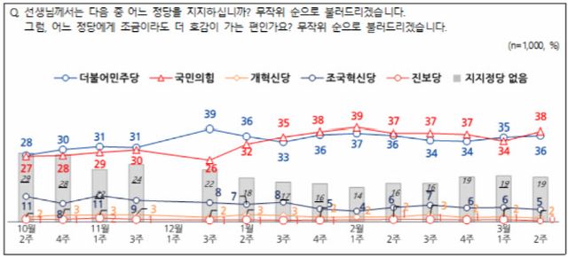 국민의힘과 민주당의 정당지지도 차이는 1월2주차부터 오차범위 내에서 움직이고 있다. 12월3주차에는 민주당(39%)이 국민의힘(26%)에 13% 앞섰으나 이후로는 오차범위 내에서 접전이다.