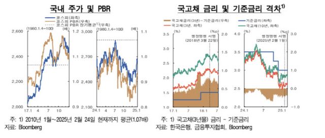 한은은 트럼프 2기의 경우 국내 주가와 장기금리가 지난해 하반기부터 관세정책 영향과 금리인하 기대 선반영으로 상당폭 하락, 향후 추가적인 영향은 제한적일 것으로 예상했다. 한은 측은 “주가는 보호무역 강화와 주력산업 경쟁력 약화, 정치 불확실성 등으로 밸류에이션이 장기 평균을 상당폭 하회하고 있다”고 설명했다.