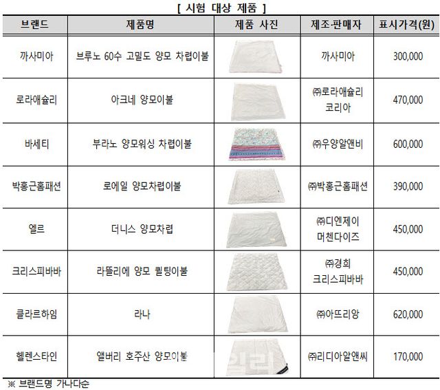한국소비자원은 13일 “소비자들이 많이 찾는 8개 브랜드에서 봄·가을 또는 사계절 사용하는 양모 100% 이불 8종을 선정해 보온성, 내세탁성, 내구성, 안전성 등을 시험 평가했다”며 이같이 밝혔다.