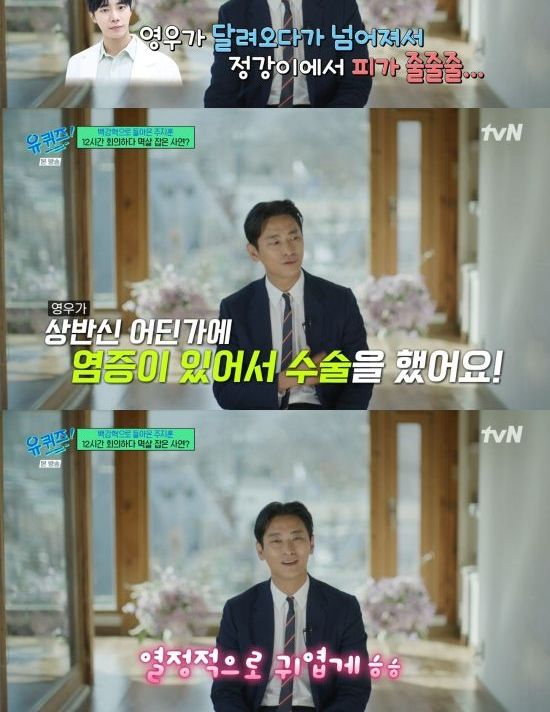 주지훈은 "나중에 보면 경비행기 타는 신이 있는데 호흡상 잘려나갔는데 모두가 공중에 떠 있는데 경원이만 뜨지 않는다. 난간을 힘으로 꽉 잡고 그런 장면도 재밌었고. 이거 웃긴 이야기는 아닌데 외식 나가는 신 있지 않냐. 거기서 영우가 달려오다 자빠져서 정강이에서 피를 줄줄줄 흘렸다. 얼른 응급처치하고 찍은 거다. 헬기 레펠 할 때도 레펠이 상반신을 다 한다. 영우가 어딘가가 염증이 있어서 수술을 했다. 그 상태에서 애가 안 아프다고 할 수 있다는데 아프지. 그런 정면도 생각나고. 열정적으로 귀엽게"라며 일화를 공개했다.