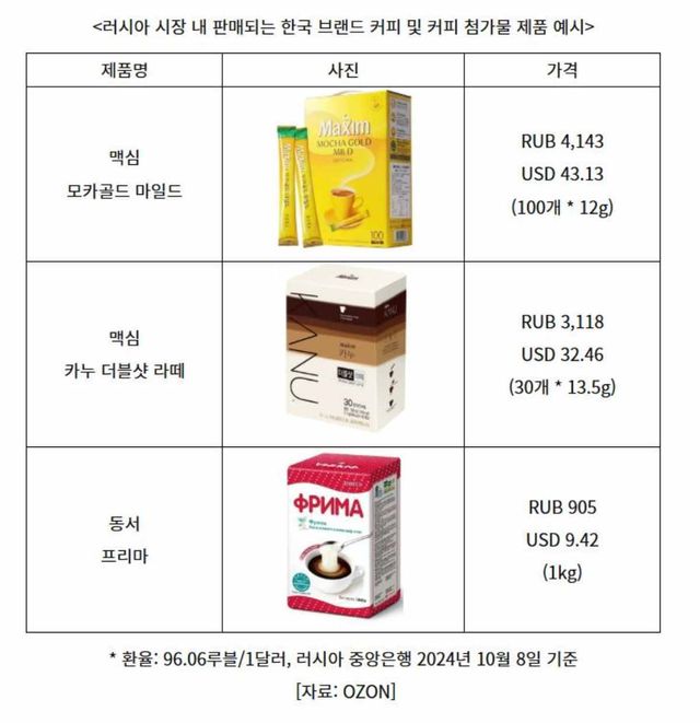 러시아 시장 내 판매되는 한국 브랜드 커피 및 커피 첨가물 제품 예시 / 2024년 10월 기준 러시아 중앙은행