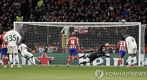 레알이 결정적 찬스를 맞이했다. 후반 23분 킬리안 음바페가 드리블로 ATM 박스 안으로 돌파했다. 이를 클레망 렁글레가 압박하다가 넘어뜨렸다. 주심은 페널티 킥(PK)을 선언했다. 키커로 비니시우스 주니어가 나섰다. 오른발로 우측 상단 구석을 향해 슈팅했지만, 골문을 크게 벗어났다.
