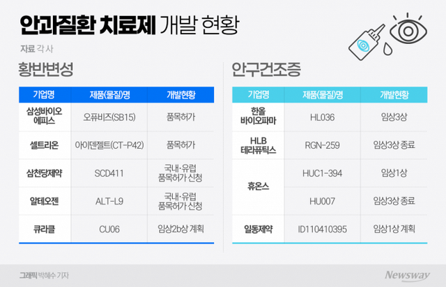13일 관련 업계에 따르면 삼성바이오에피스, 셀트리온 등은 황반변성 치료제 '아일리아' 바이오시밀러에 대해 국내외 품목허가를 받았다. 한올바이오파마, 휴온스, HLB테라퓨틱스 등은 안구건조증 치료제를 개발 중이다.