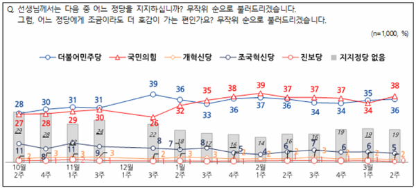 여론조사기관 엠브레인퍼블릭·케이스탯리서치·코리아리서치·한국리서치가 지난 10일~12일 전국 만 18세 이상 남녀 1000명을 대상으로 실시한 여론조사에서 정당 지지율은 국민의힘 38%, 더불어민주당 36%, 조국혁신당 5%, 개혁신당 2%로 나타났다. 국민의힘은 지난 조사에 비해 4%p 상승했고, 민주당은 1%p 상승했다.
