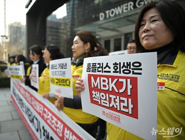 홈플러스 상품권 보이콧 사태가 번지고 있다. 사진은 홈플러스 기업회생절차 실행에 대해 대주주 MBK의 책임을 촉구하는 집회 모습. 사진=이수길 기자 Leo2004@newsway.co.kr